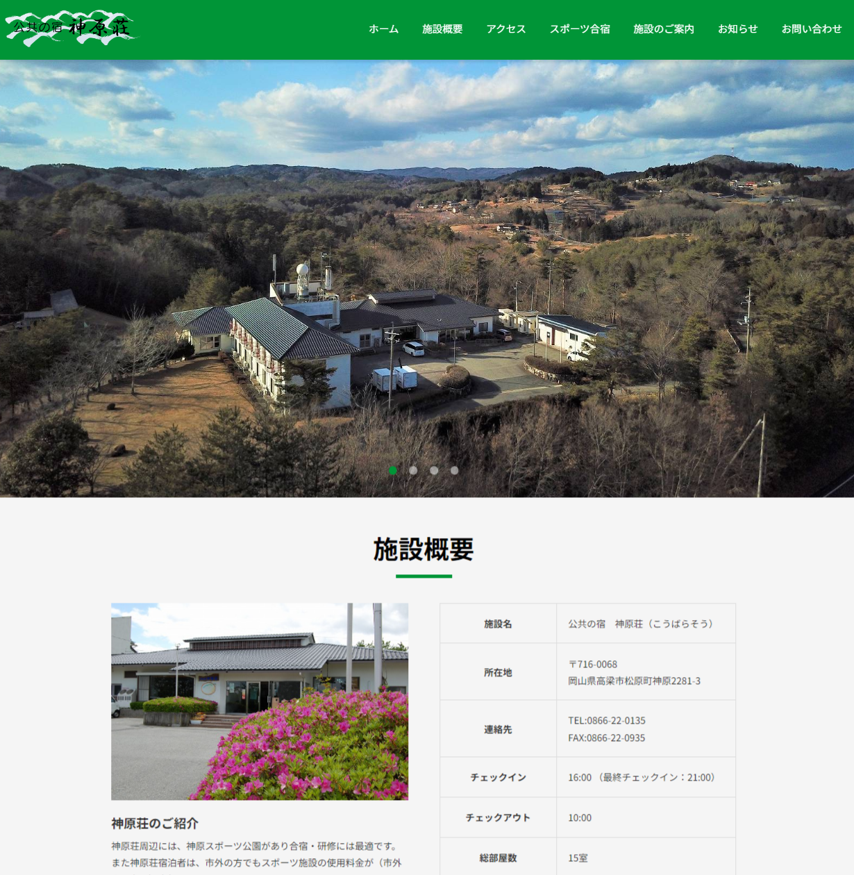 パッケージ商品FrontEngineの「ギャラリー機能」を使って施設のご案内を、オプションで付けられるページ追加で「スポーツ合宿」のページを作成しました。